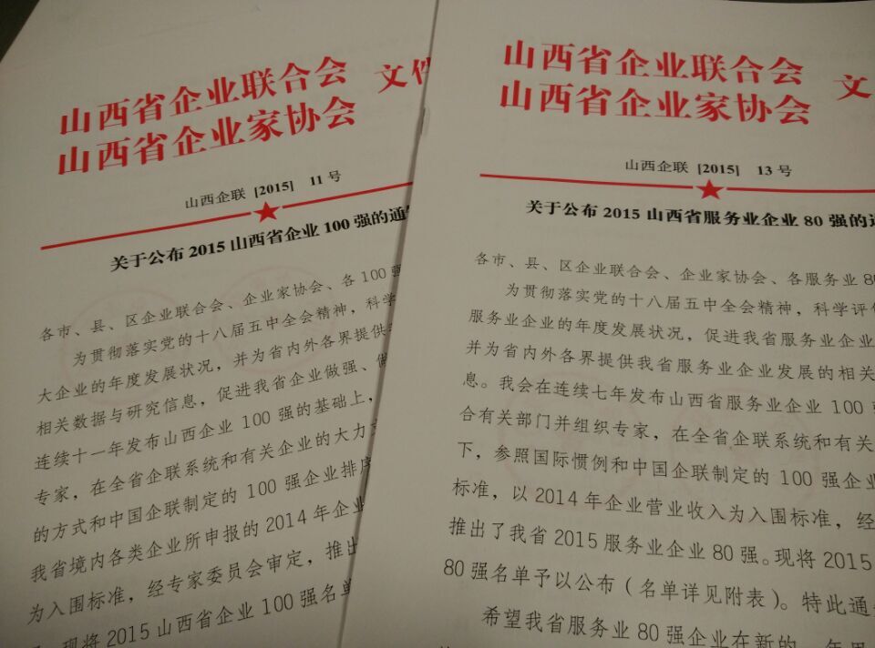 2015年12月9日,關(guān)于山西省企業(yè)聯(lián)合會(huì)、山西省企業(yè)家協(xié)會(huì)下發(fā)的文件《關(guān)于公布2015年山西省企業(yè)100強(qiáng)的通知》及《關(guān)于公布山西省服務(wù)業(yè)企業(yè)80強(qiáng)的通知》中,山西華宇集團(tuán)在2015山西省企業(yè)100強(qiáng)中位列49名,在2015山西省服務(wù)業(yè)企業(yè)80強(qiáng)中位列12名。